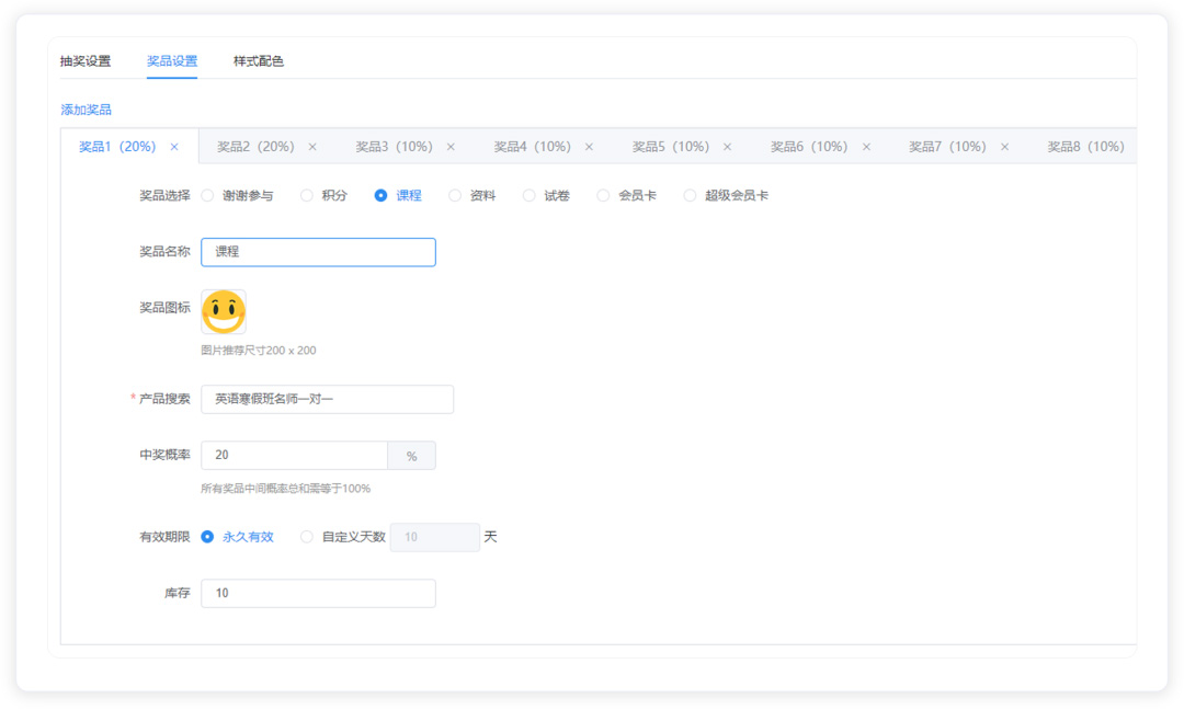 偶信本周给大家带来新的裂变营销插件啦,幸运抽奖(688元),支持两种模式(大转盘、九宫格),支持积分抽奖,支持设置用户总抽奖及每天抽奖次数,支持设置样式配色,支持设置奖品中奖概率,支持的奖品类型有谢谢参与、积分、课程、资料、试卷、会员卡。